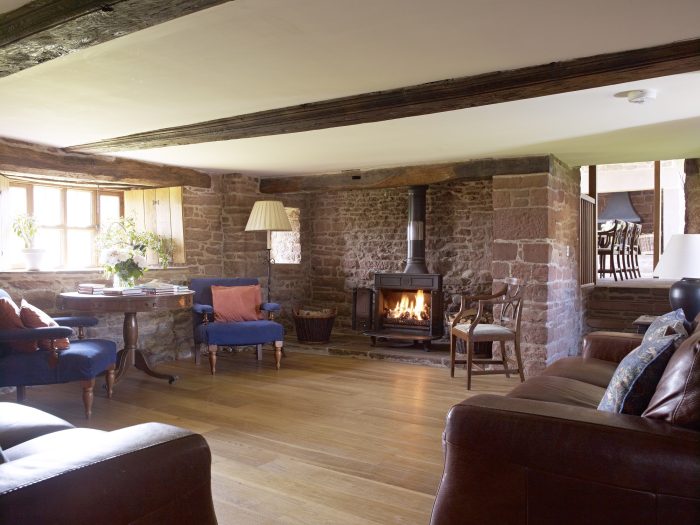 Glassonby Hall has a sandstone-flagged and galleried dining room with a massive stone fireplace. The dining hall’s double doors open onto a sandstone terrace leading into Glassonby Hall’s front garden. The sitting room has a second wood-burning cast iron stove. The large breakfasting kitchen has a four oven Aga, a separate four burner hob, an electric oven and a utility room with a ground floor cloakroom. The kitchen opens onto the gated rear private garden. The Daleraven Room on the ground floor is a double bedroom with zip link beds that may be joined as a 6′ super king size bed. It has a wc & shower room with original sandstone walled well preserved below the glass flooring.