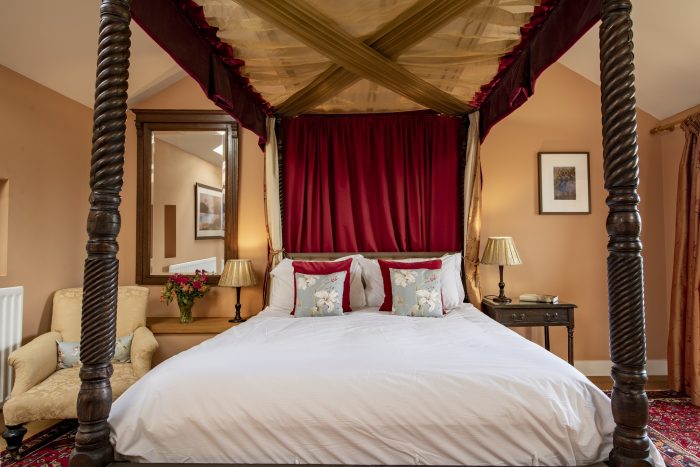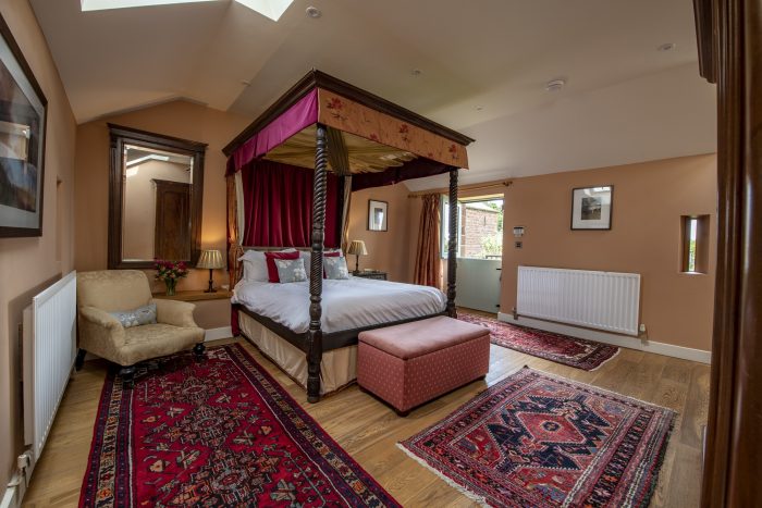 The Master Bedroom suite is accessed along the oak gallery and has a 5′ four poster bed with an ensuite bathroom with a separate rainfall shower. On the other side of the elevated gallery are the Addingham Room which has a 5′ carved antique bed and the Salkeld twin bedroom which has two 3′ beds. These bedrooms are located next to the family bathroom which has a cast iron bath and separate shower.